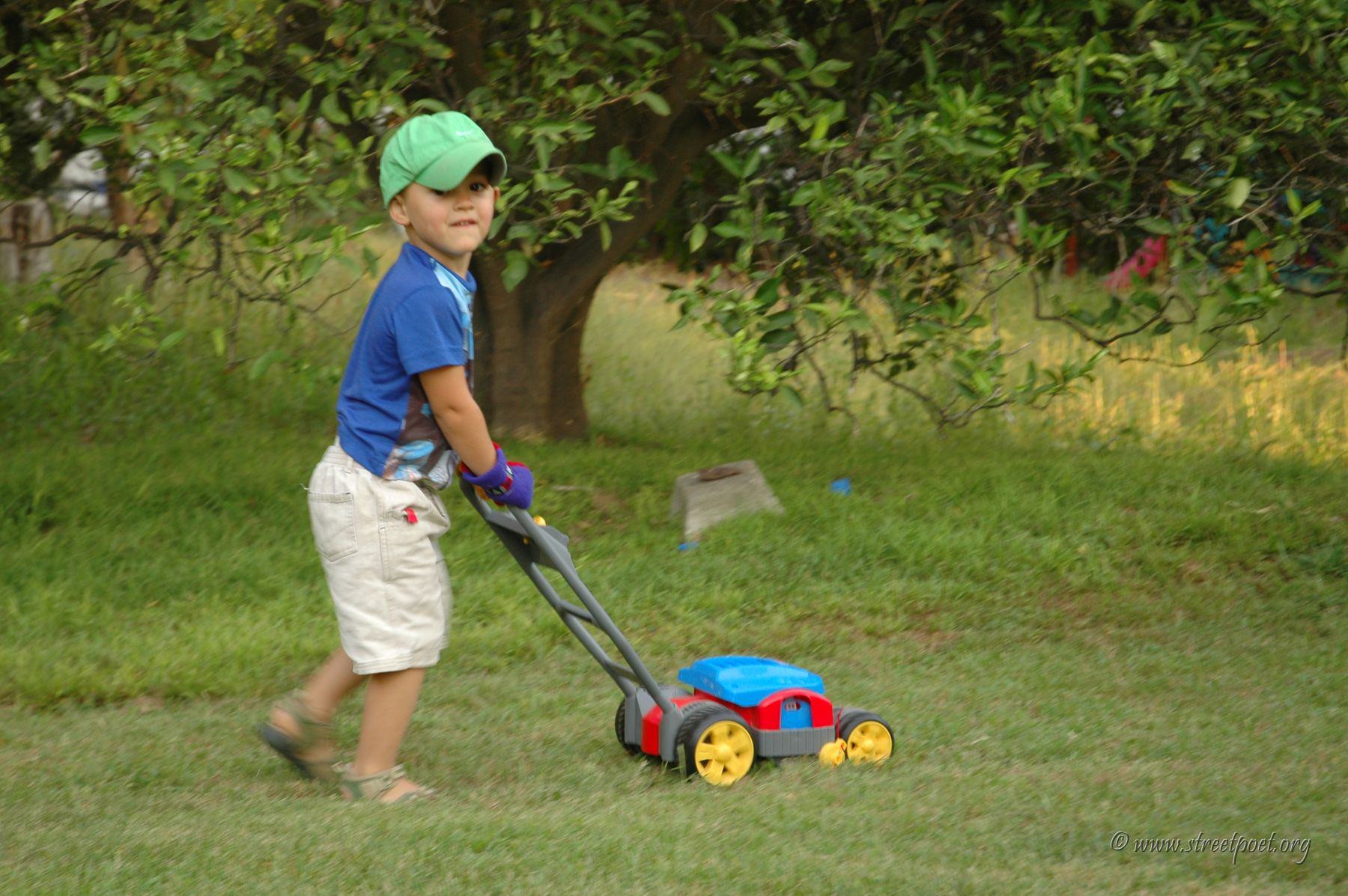 Seth is "lawning" with his new mower every day!