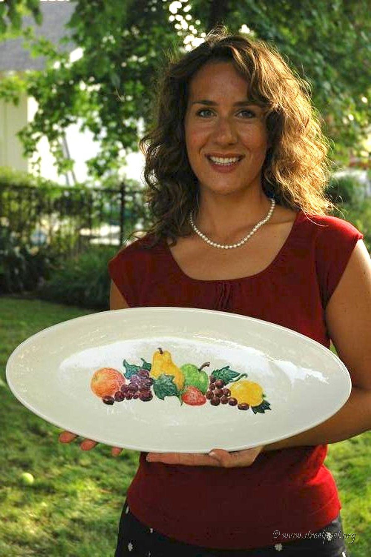 Donna holding the platter that her sisters made for her in San Louis Obispo.